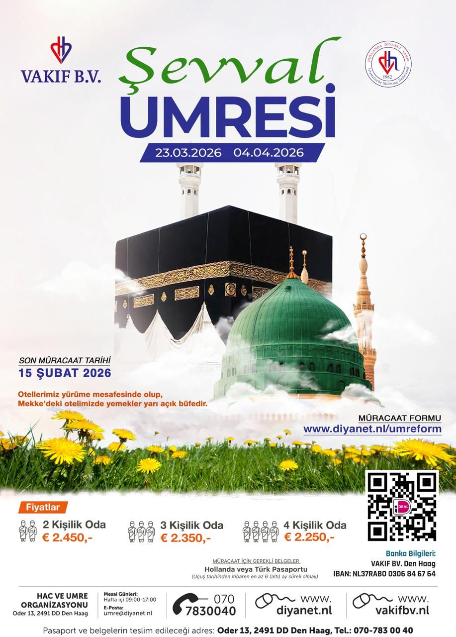 Vakıf BV. Hac ve Umre şirketimiz tarafından, Hollanda Diyanet Vakfı iş birliği ile “2025-2026 Döneminde Umre Turları” düzenlenecektir. Umre turlarımızın tarihleri aşağıdaki tabloda belirtilmiştir. 2025 Yılı Ekim Ayından başlayıp 2026 Yılı Şubat ayında sona erecek olan umre turlarımız ile ilgili müracaat şartları ve fiyatlar aşağıdaki şekilde güncellenmiştir. Umre programlarımıza katılmak isteyenlerin bu şartları haiz olmaları gerekmektedir.